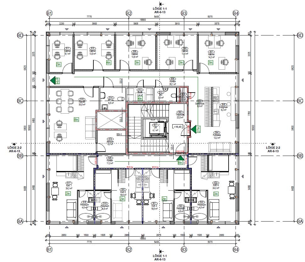 - II, III, IV ja V korrusel büroopinnad ettevõtetele ja ettevõtluse tugiorganisatsioonidele 2-4 kohalistes kabinettides ning töökohad avatud kontoris. Igal korrusel on kööginurk, puhkeala, nõupidamisruumid